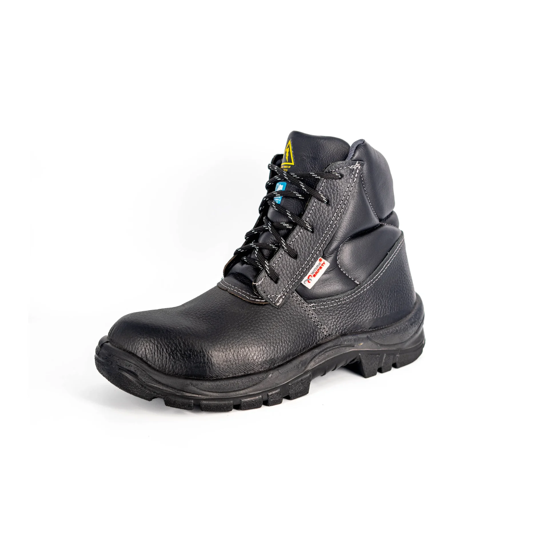 Calçado de segurança tipo bota meio cano, fechamento em cadarço preto, confeccionado em couro, palmilha de montagem resistente a perfuro, com biqueira de composite, solado em poliuretano bidensidade. Manobreiro.