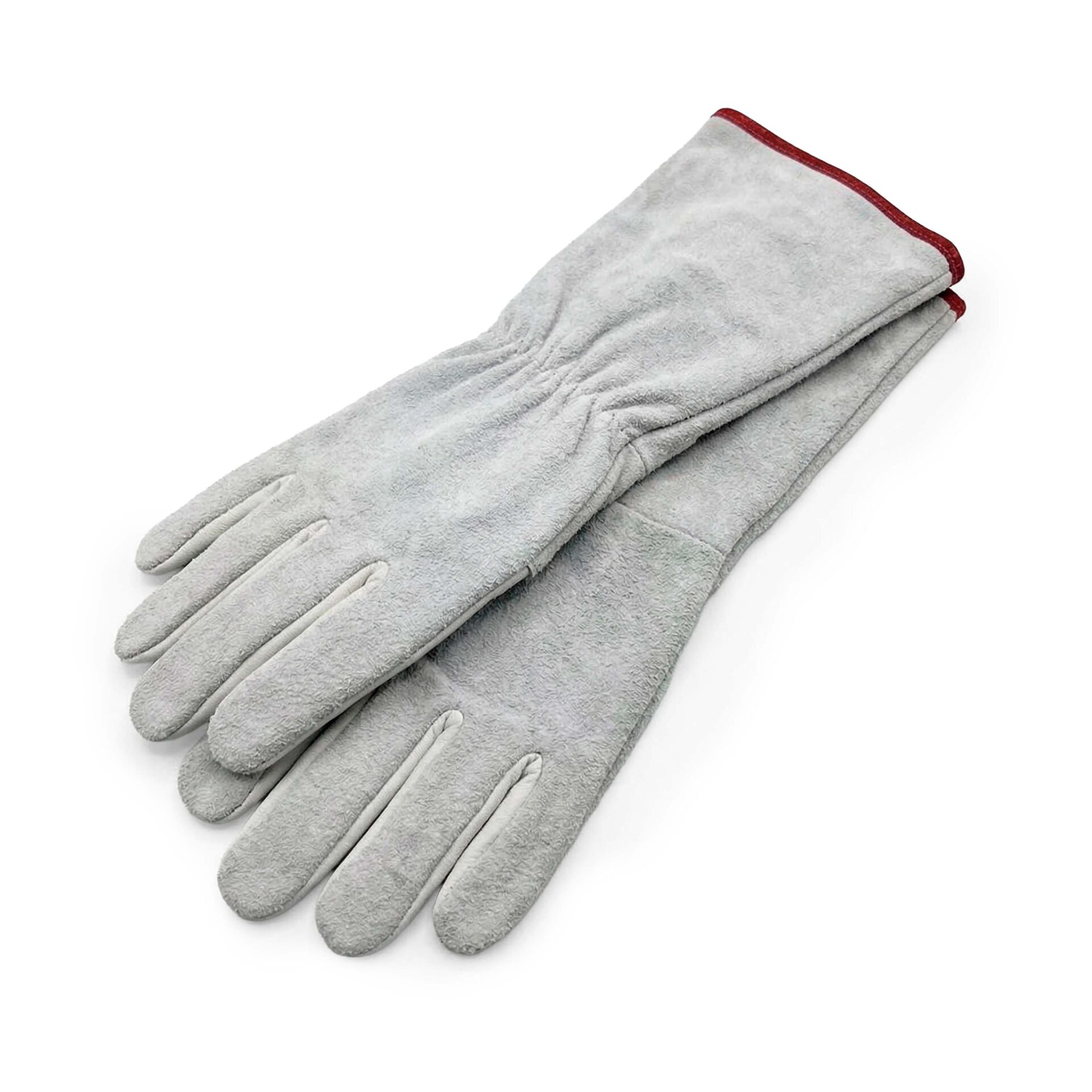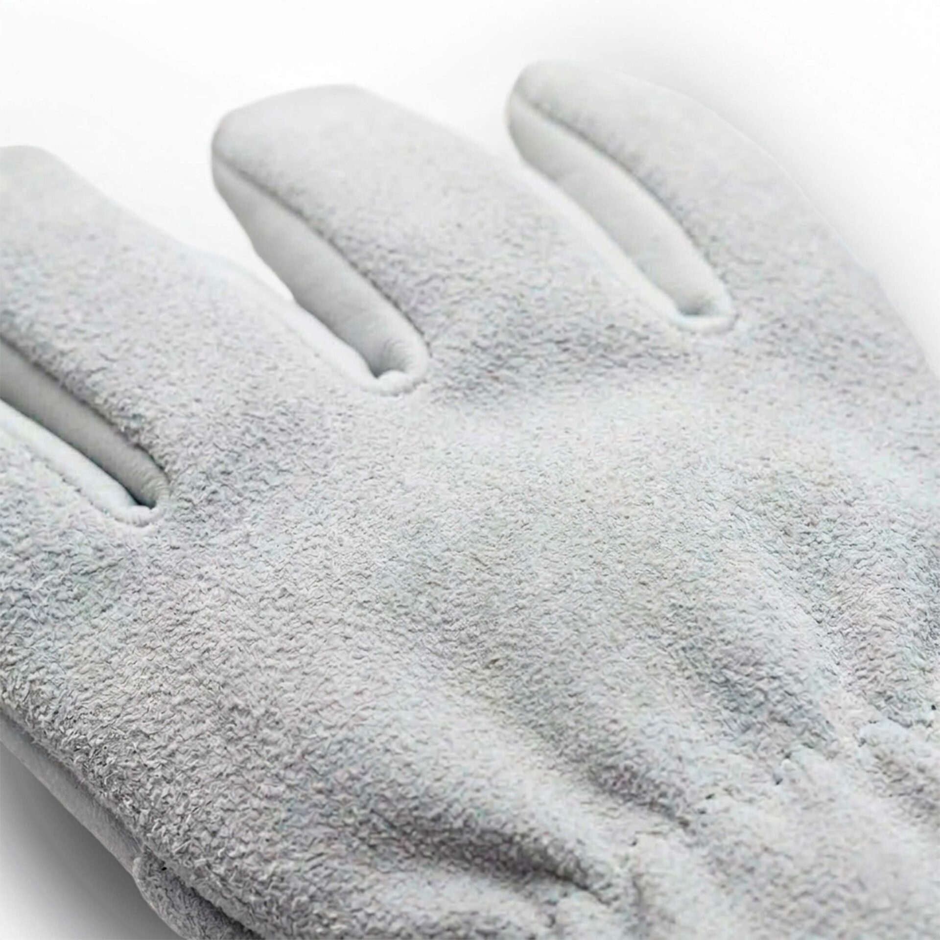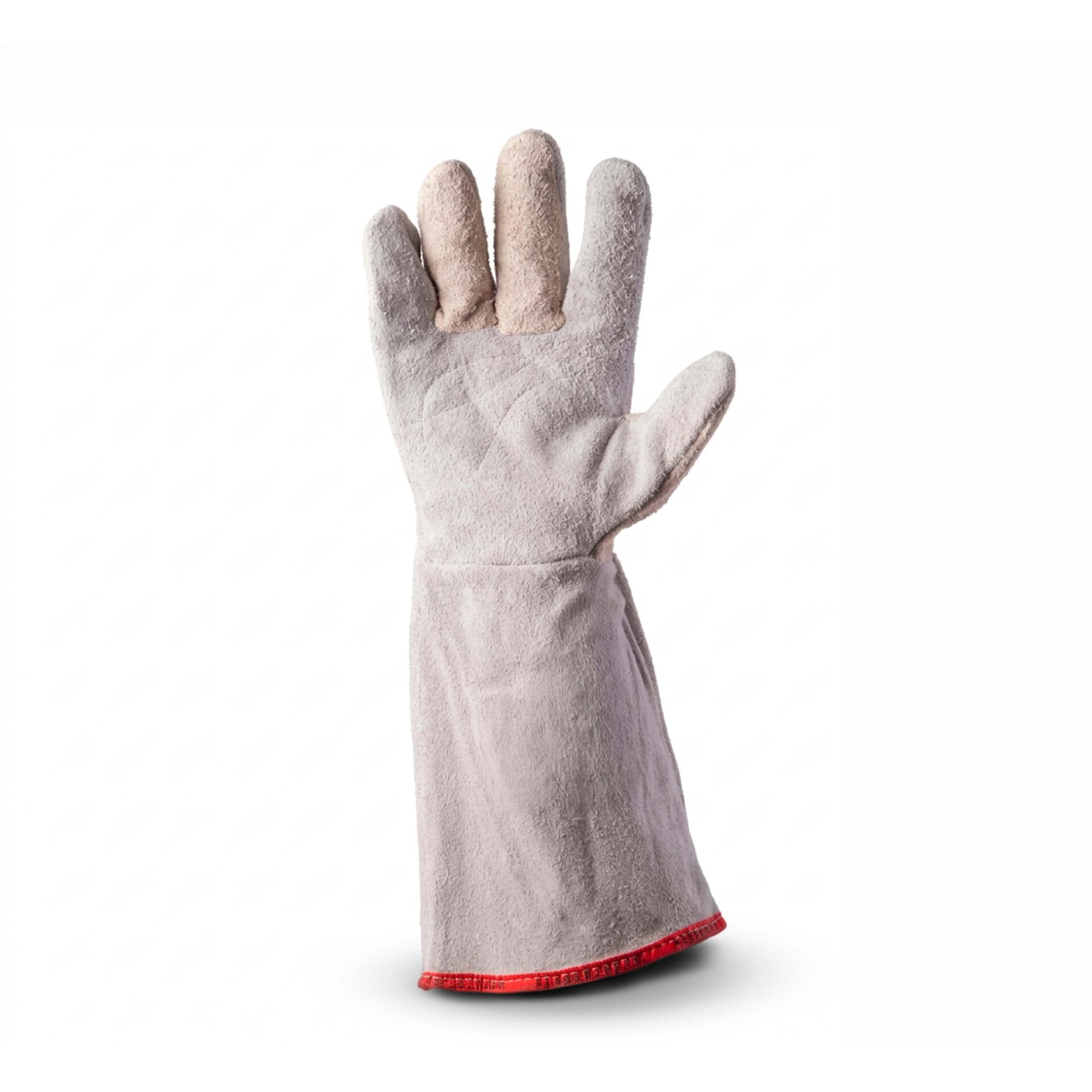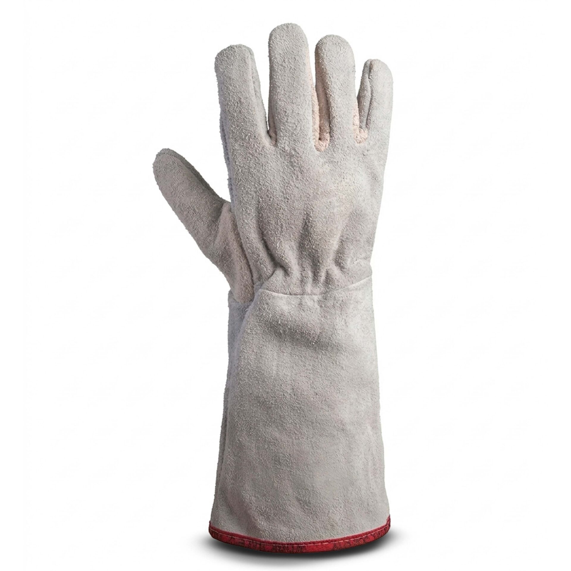 Luva de segurança confeccionada em raspa, reforço interno na palma, elástico no dorso para ajuste.