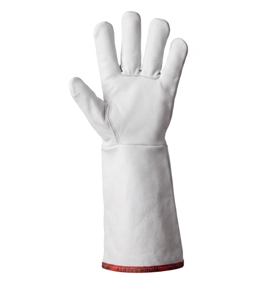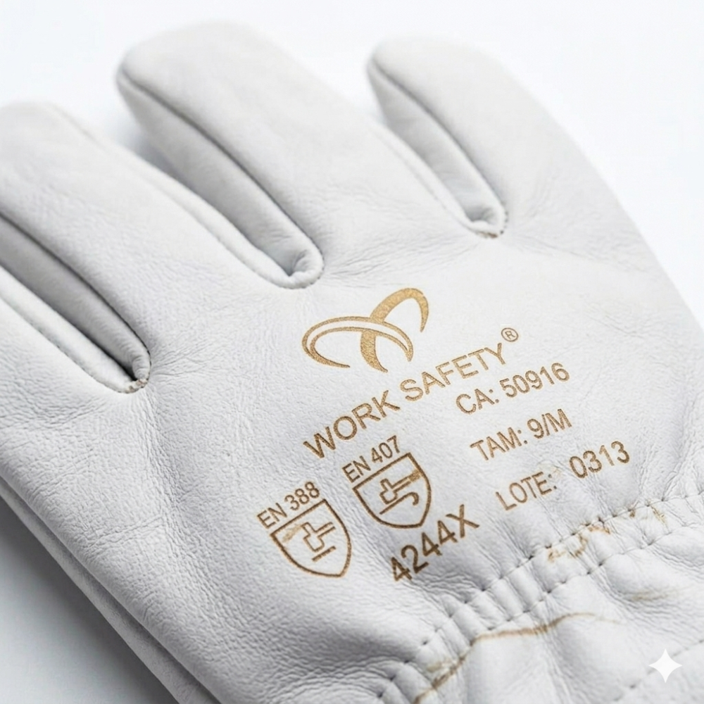 Luva de segurança confeccionada em vaqueta, modelo montepellier, tira de reforço em vaqueta embutida na parte lateral interna do polegar e na junção da palma com os dedos médio e anelar, reforço interno em vaqueta na palma, dorso em vaqueta, punho em raspa com elástico.